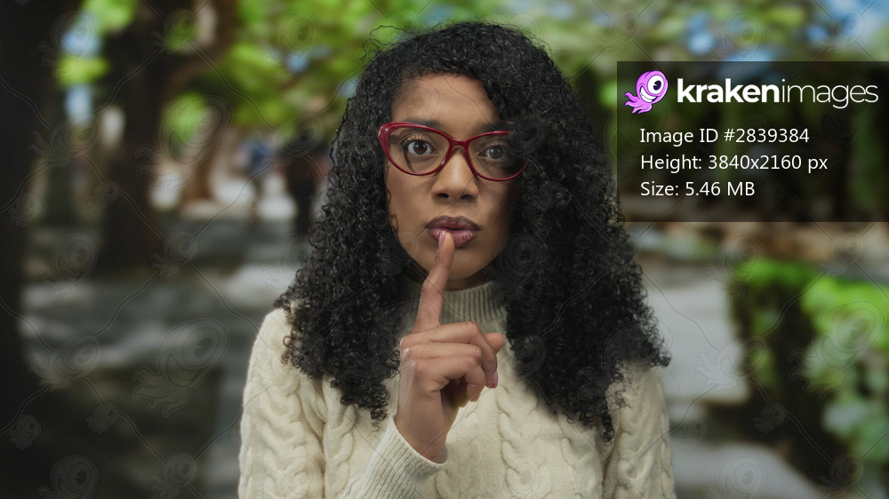 Woman wearing cream sweater and red glasses holds finger to lips for silence in a forest walkway; serenity.