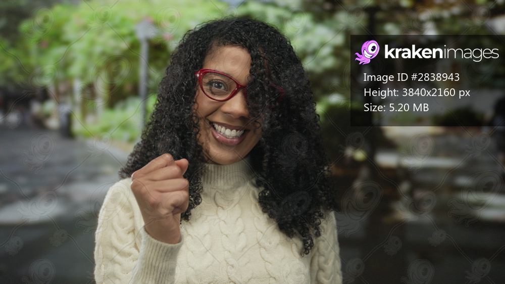 Woman wearing cream sweater and red glasses pumps fist in green park; optimism confidence success growth.