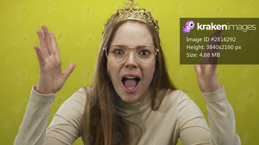 Woman wearing crown and glasses raises hands with open mouth in studio against chartreuse wall; frustration.