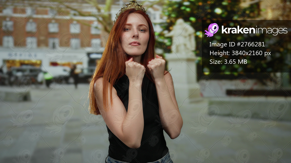 Woman wearing crown poses playfully on city street with fists up against festive backdrop and blurred architecture in background.