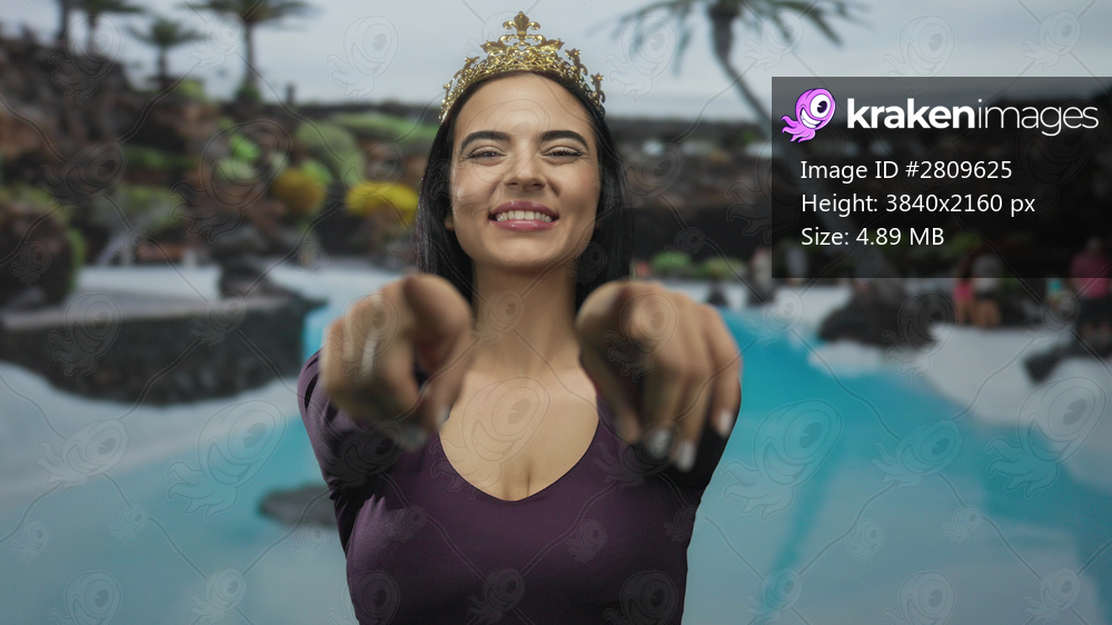 Woman wearing crown smiling at camera in outdoor resort by pool, suggesting vacation vibes and relaxation in a hotel setting with lush greenery around. - Kraken Images