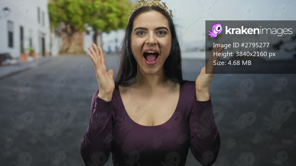 Woman wearing crown stands joyfully on a charming street with white buildings and green trees, embodying happiness and youthful spirit in an outdoor setting. - Kraken Images