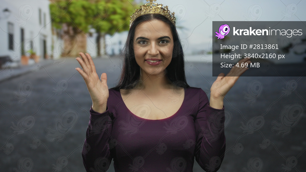 Woman wearing crown stands joyfully on a charming street with white buildings and green trees, embodying happiness and youthful spirit in an outdoor setting. - Kraken Images
