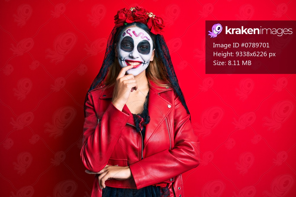 Woman wearing day of the dead costume over red looking confident at the camera with smile with crossed arms and hand raised on chin. thinking positive. - Kraken Images
