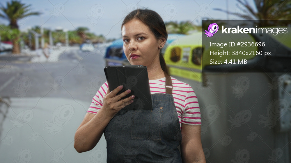 Woman wearing denim apron holding tablet with both hands beside a yellow recycling container on street; focus productivity.