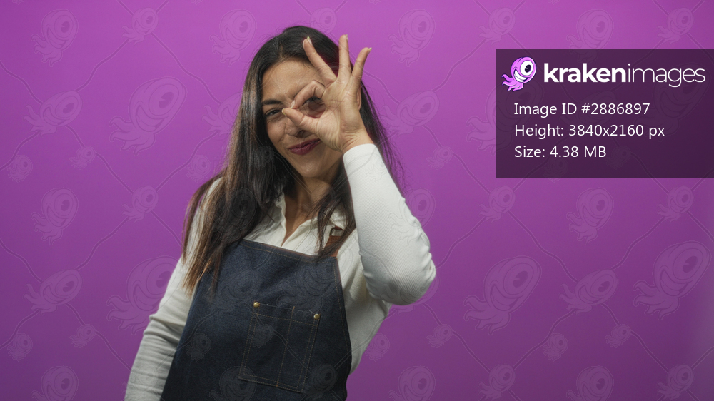Woman wearing denim apron making ok sign with hand around eye and smiling in purple studio; playful surprise curiosity approval.