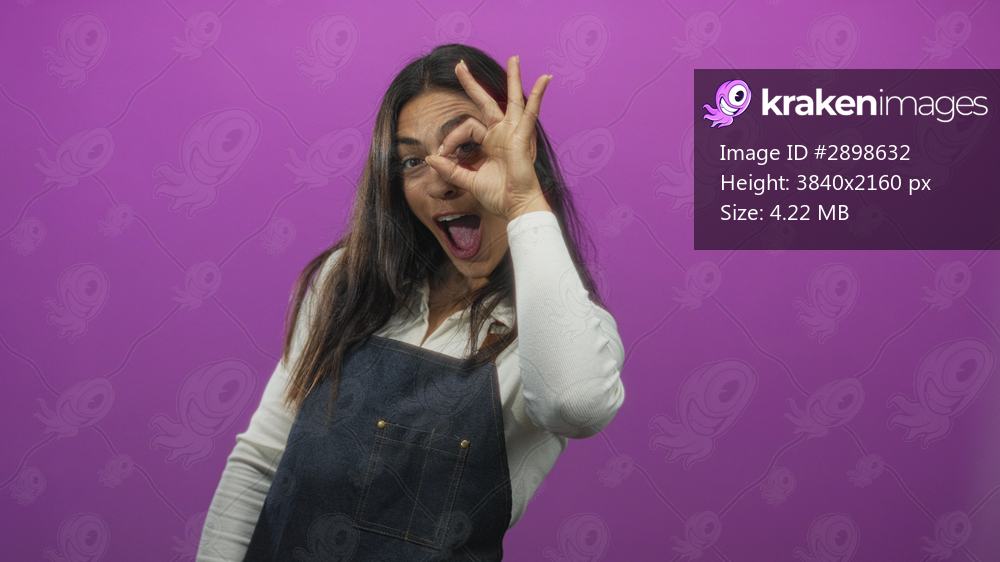 Woman wearing denim apron making ok sign with hand around eye and smiling in purple studio; playful surprise curiosity approval.