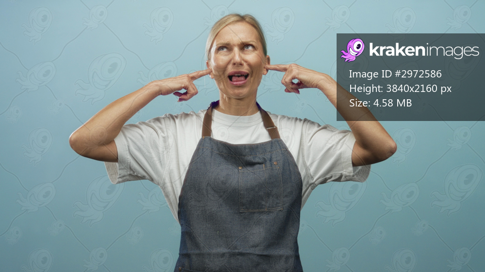 Woman wearing denim apron plugs fingers into ears while squinting in studio with blue backdrop; frustration defiance.