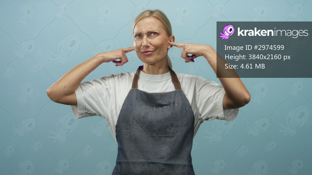 Woman wearing denim apron plugs fingers into ears while squinting in studio with blue backdrop; frustration defiance.