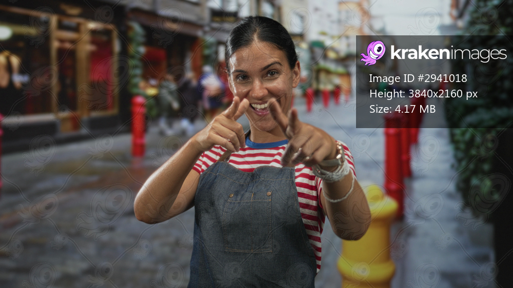 Woman wearing denim apron and red striped shirt with hand to chest and pointing fingers up on a cobbled city street; gratitude joy.