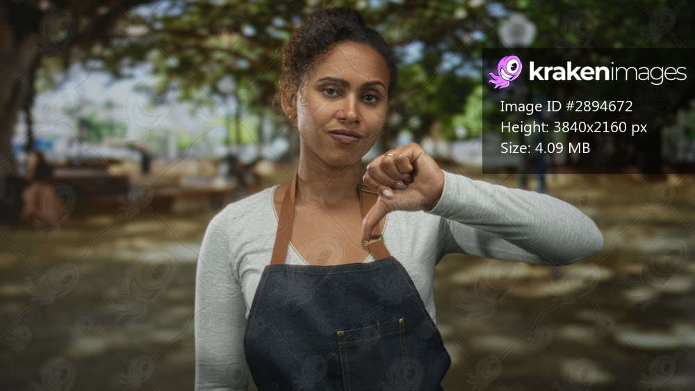 Woman wearing denim apron showing thumbs down gesture on street near park benches and green trees under daylight; disapproval.
