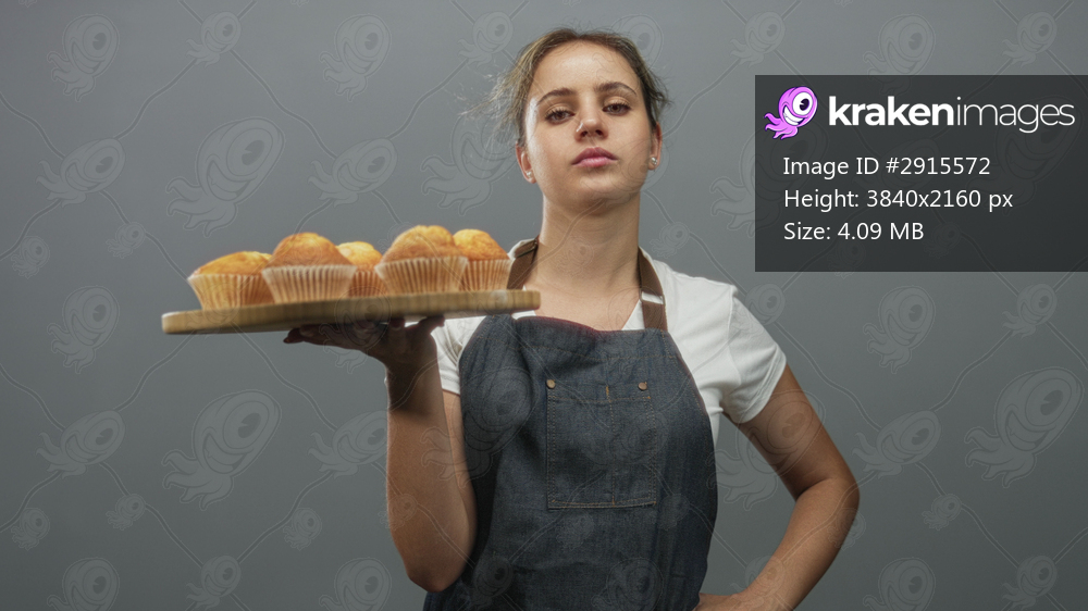 Woman wearing denim apron and white shirt holds wooden board of muffins with hand extended in studio gray wall; confidence craft.