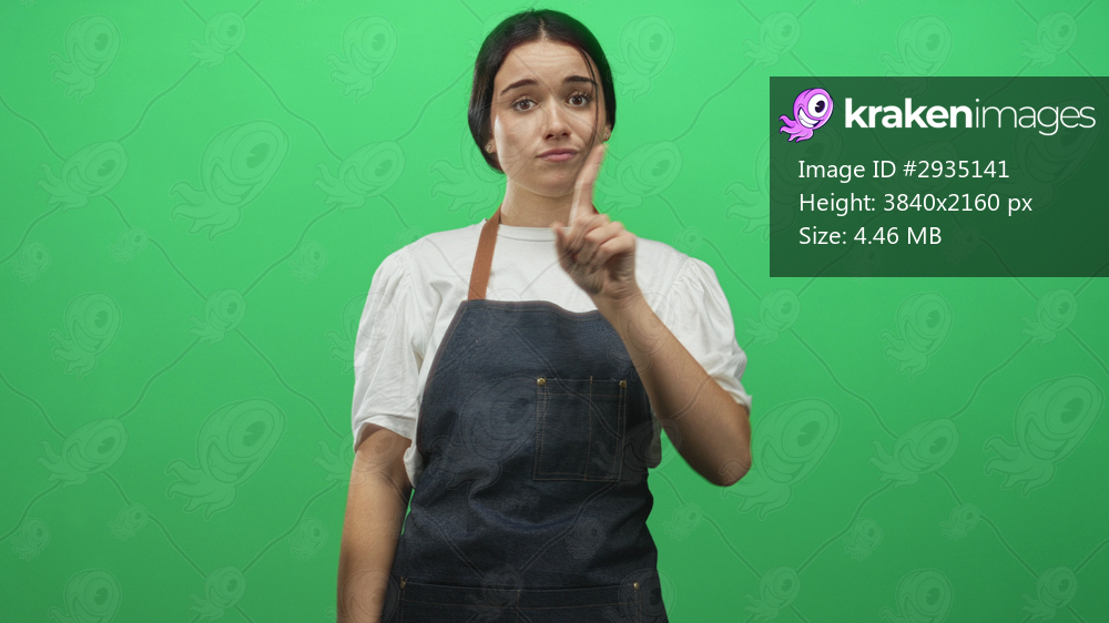 Woman wearing denim apron and white shirt points index finger forward with raised eyebrow in studio green screen setting; gentle warning.