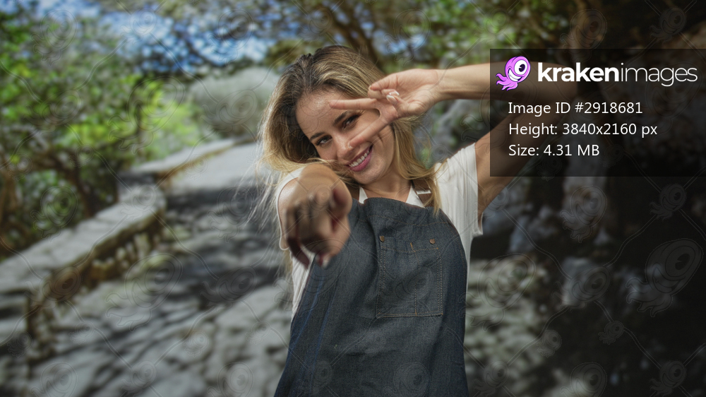 Woman wearing denim apron and white tee points finger to camera and peace sign to eye on stone path in forest while smiling; playful confidence.