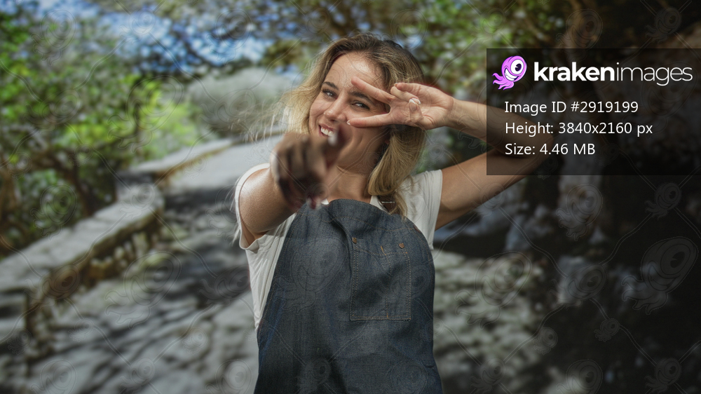 Woman wearing denim apron and white tee points finger to camera and peace sign to eye on stone path in forest while smiling; playful confidence.