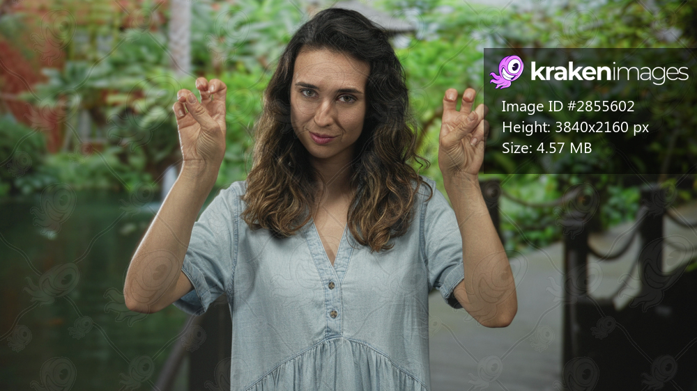 Woman wearing denim dress makes air quotes with hands at green forest walkway near water pond; skepticism.