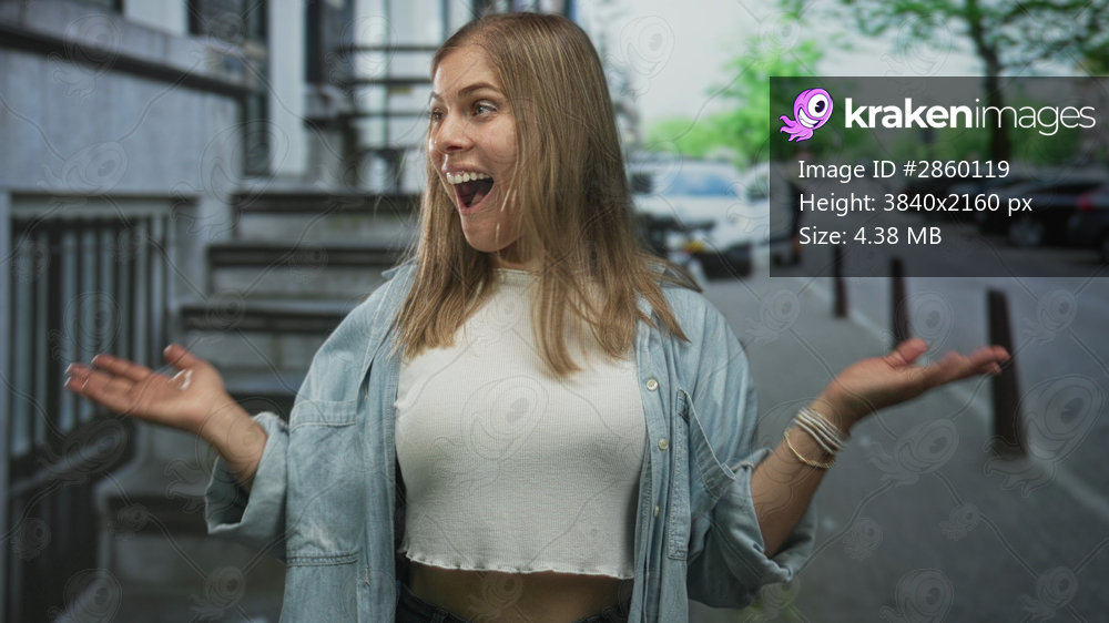 Woman wearing denim jacket over white shirt raises arms over her head on a busy street with open mouth; excitement.