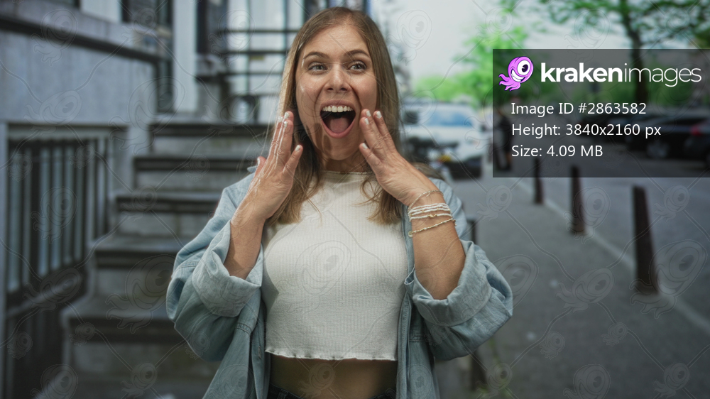 Woman wearing denim jacket over white shirt raises arms over her head on a busy street with open mouth; excitement.