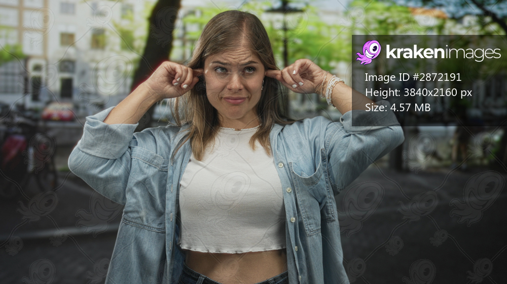 Woman wearing denim shirt and white crop top pulls at ears on street by an amsterdam canal; annoyance.