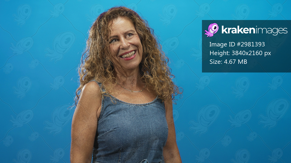 Woman wearing denim sleeveless top, curly hair, laughing with head tilt and gold necklace, shoulders exposed, standing against blue studio backdrop; joy vitality. - Kraken Images