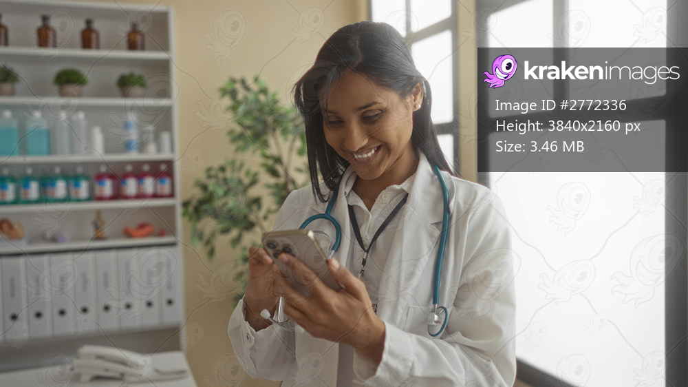 Woman wearing doctor attire smiling at phone inside clinical room showcasing a warm and professional healthcare setting with bright natural light and organized shelves. - Kraken Images