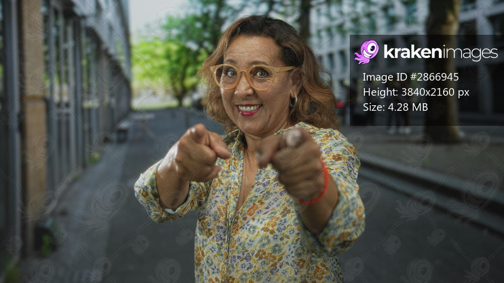 Woman wearing eyeglasses and a floral blouse finger pointing to camera on urban street with blurred pedestrians; confidence.