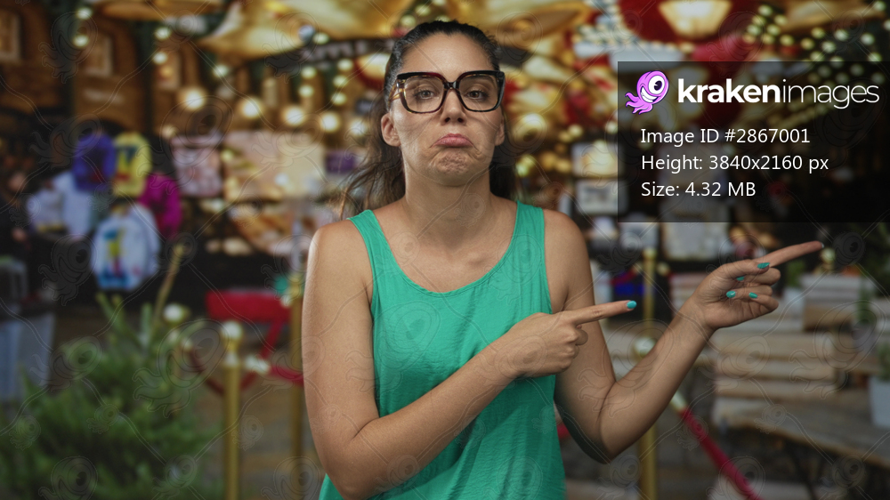 Woman wearing eyeglasses and green tank top points finger at souvenir stall in street market; uncertainty.