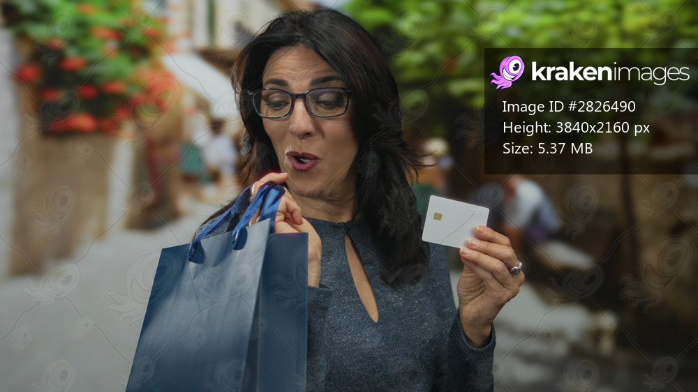 Woman wearing eyeglasses holding a white creditcard and blue shoppingbag while smiling on a street; empowerment.