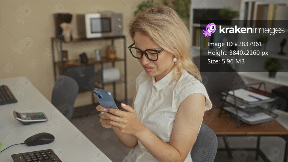 Woman wearing eyeglasses holding smartphone with both hands at desk in office building; work frustration.
