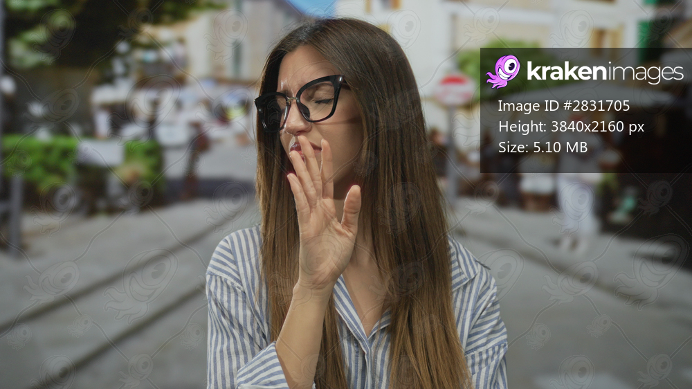 Woman wearing eyeglasses holds hand to mouth mid expression on busy city street lined with cafes and pedestrians; disgust aversion distaste displeasure. - Kraken Images