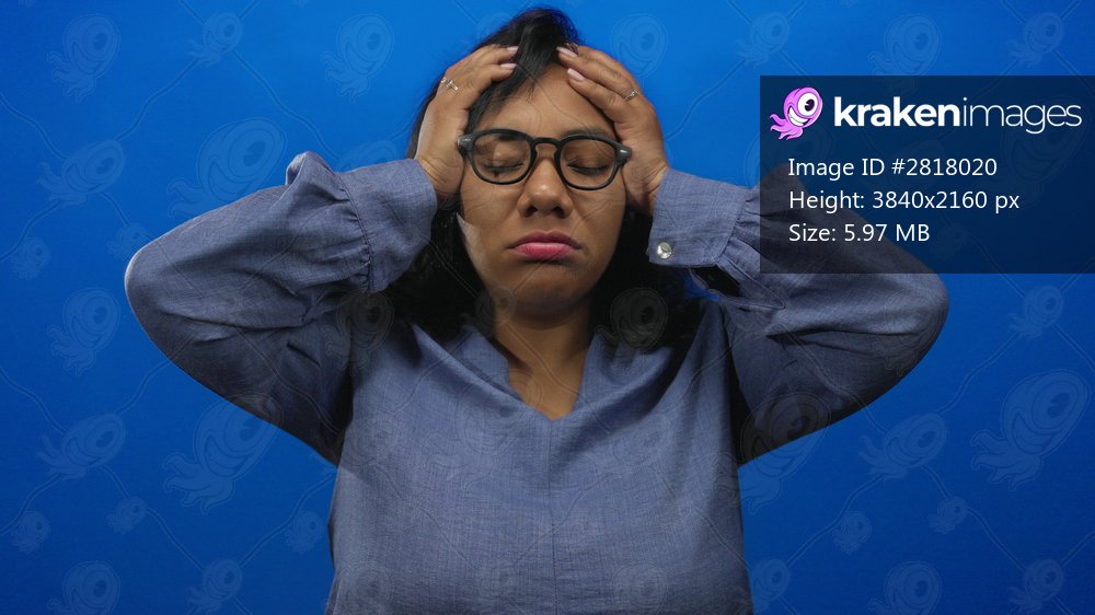 Woman wearing eyeglasses holds temples with both hands against blue studio wall showing physical discomfort; stress.
