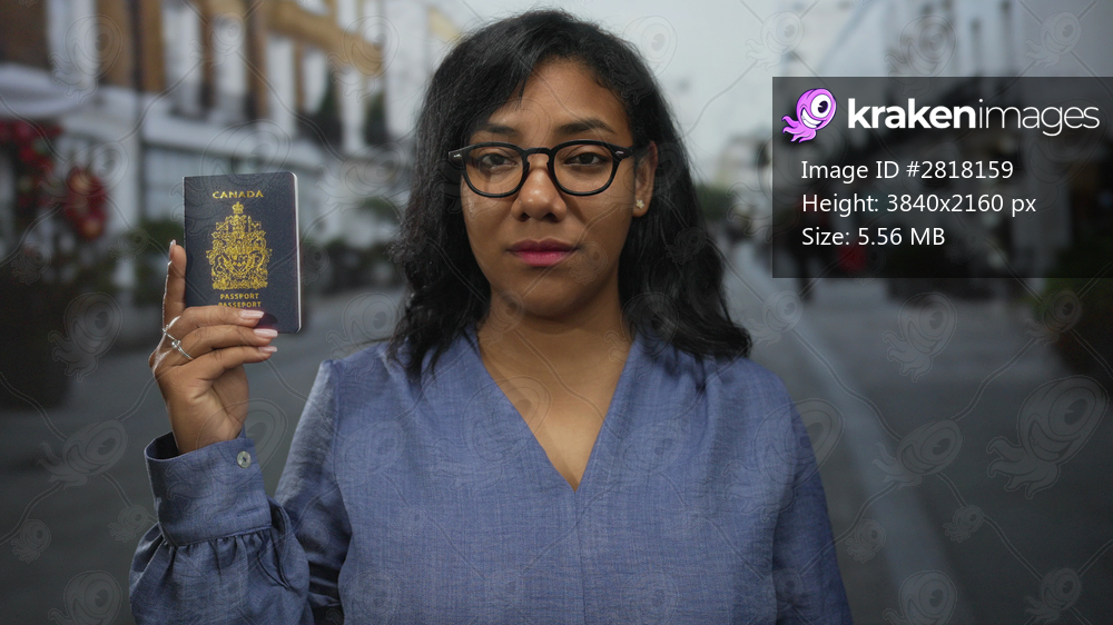 Woman wearing eyeglasses holds up canadian passport and glances sideways in city street during daylight; pride identity.