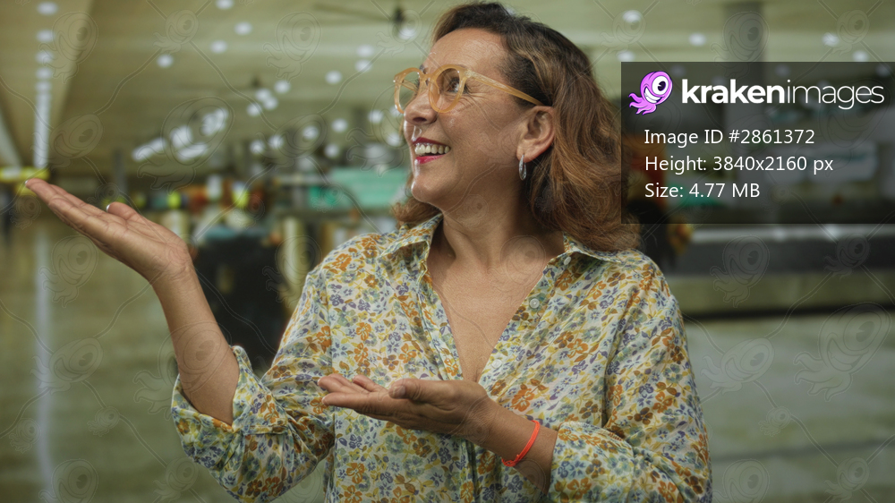 Woman wearing floral blouse gestures open palms toward baggage carousel at busy airport terminal; anticipation.