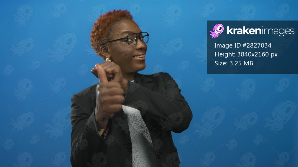Woman wearing glasses and a black blazer smiles and gives thumbs up gesture in blue studio; optimism.