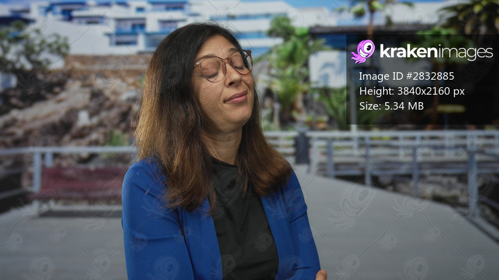 Woman wearing glasses and a blue jacket with arms crossed and tilting head on a street walkway; rejection.