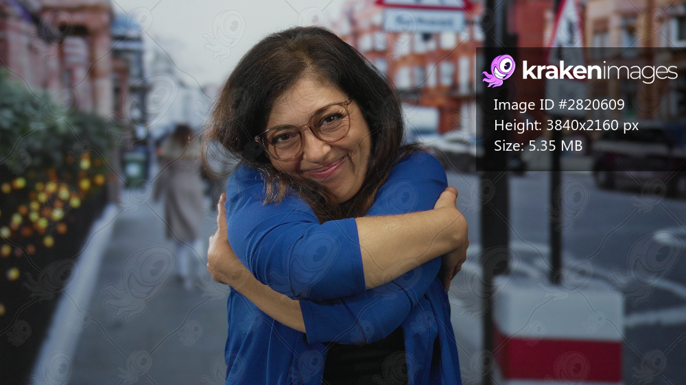 Woman wearing glasses and a blue shirt smiling while hugging herself on a busy urban street in daytime; self acceptance.