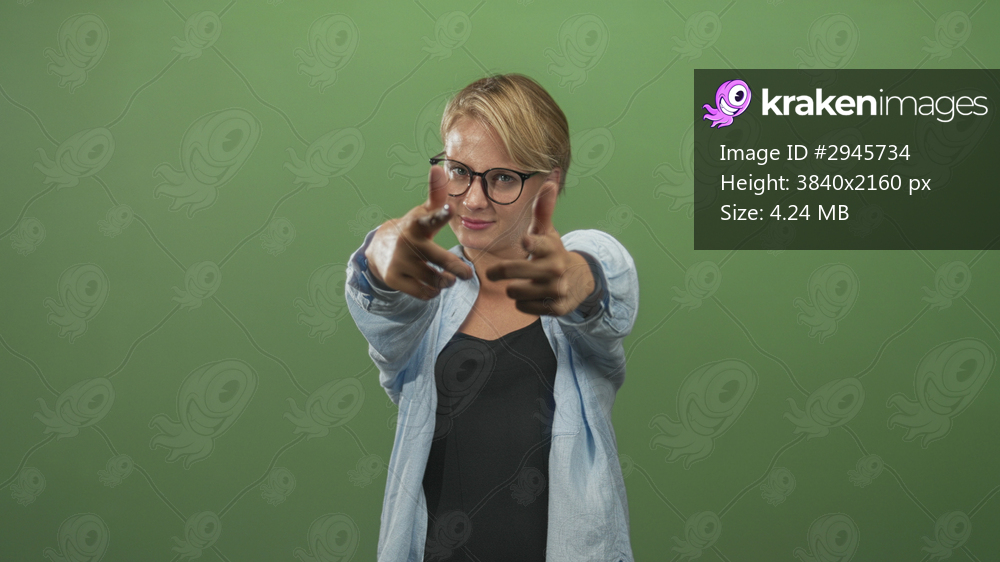 Woman wearing glasses and a casual shirt points both index fingers like finger guns toward camera in studio green screen; playful confidence.