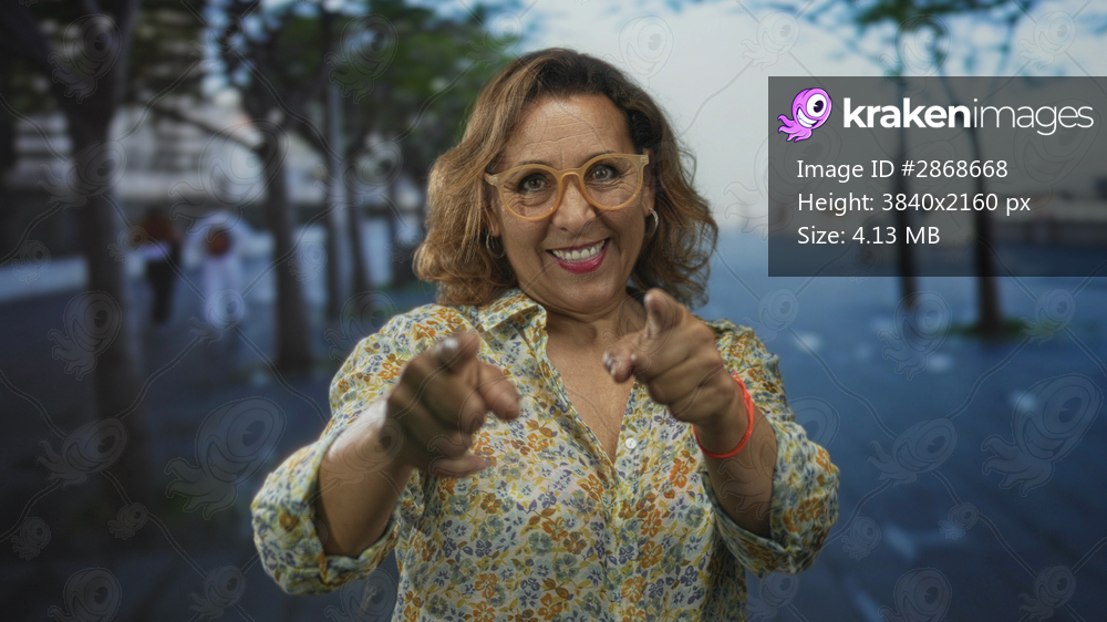 Woman wearing glasses and a floral blouse smiles and points forward with both fingers on urban street; confidence.