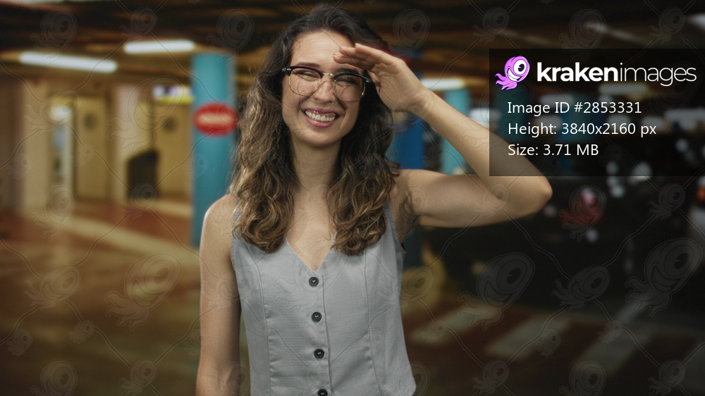 Woman wearing glasses and a gray vest smiling beside a parked car under fluorescent lights in a multilevel parking building; joy.