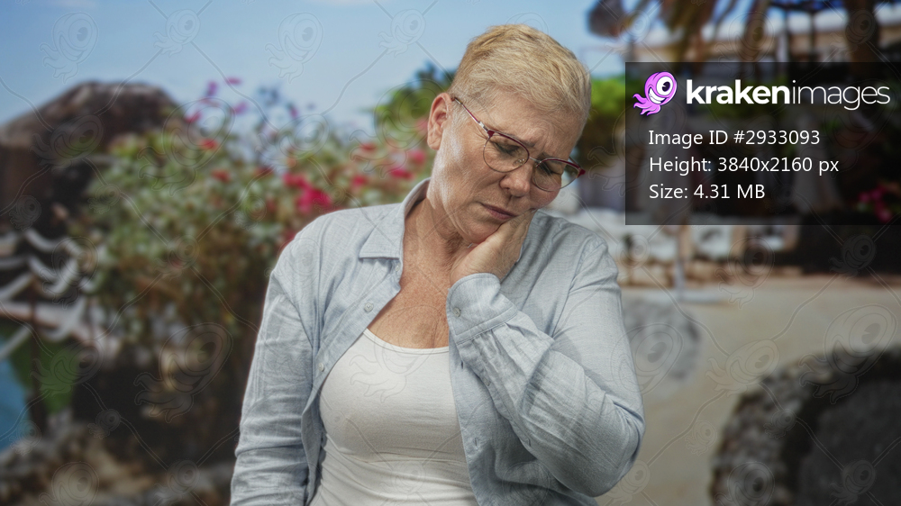 Woman wearing glasses and a light blue shirt holding cheek and grimacing with hand on jaw in front of a building; toothache pain.