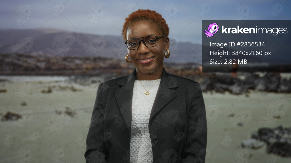 Woman wearing glasses and a necklace smiles with eyes closed on rocky beach shore under soft sunlight; serenity.