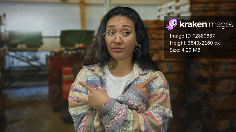 Woman wearing glasses and a patterned shirt crossing arms and pointing index fingers in opposite directions inside a storage building with stacked wooden crates; doubt. - Kraken Images