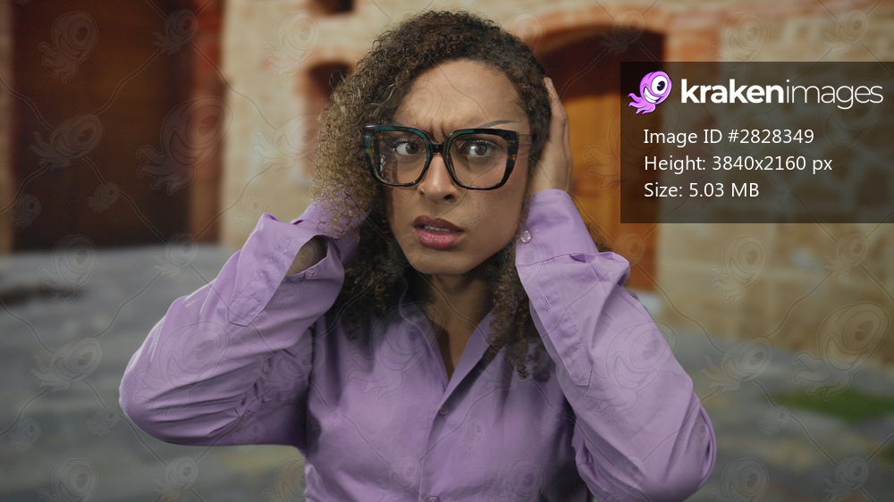 Woman wearing glasses and a purple shirt covers her ears with hands on a cobblestone street in old town; discomfort.