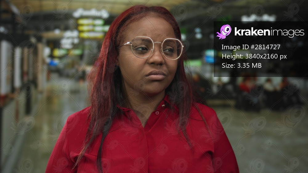 Woman wearing glasses and a red shirt frowns at a departure board in airport terminal; travel anxiety.