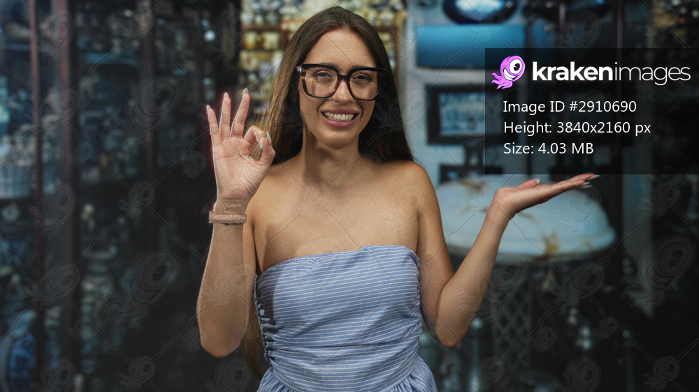 Woman wearing glasses and a strapless dress showing ok sign with bare shoulders and open smile in studio; confidence.