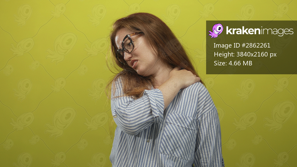 Woman wearing glasses and a striped shirt clutching her right shoulder in a bright green studio set; discomfort.