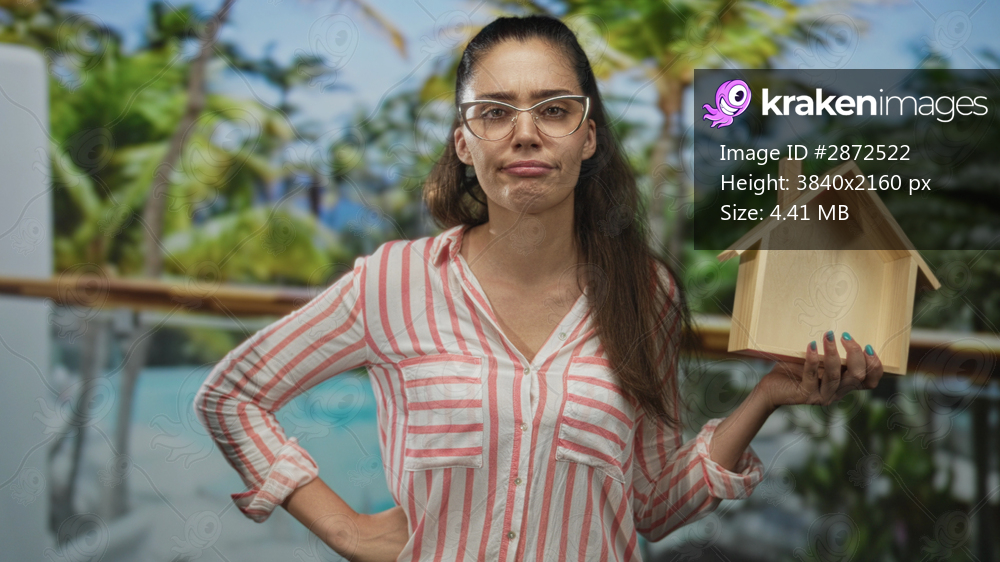 Woman wearing glasses and a striped shirt holds a wooden house and shakes a finger in a studio resort set; real estate skepticism.