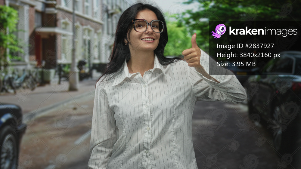 Woman wearing glasses and a striped white shirt raising thumb in a thumbs up gesture on a street; confidence.