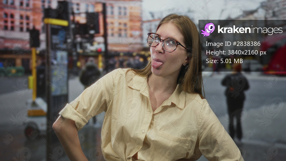 Woman wearing glasses and a tied shirt with hands on hips sticking tongue out on crowded street with red bus in background; playfulness.