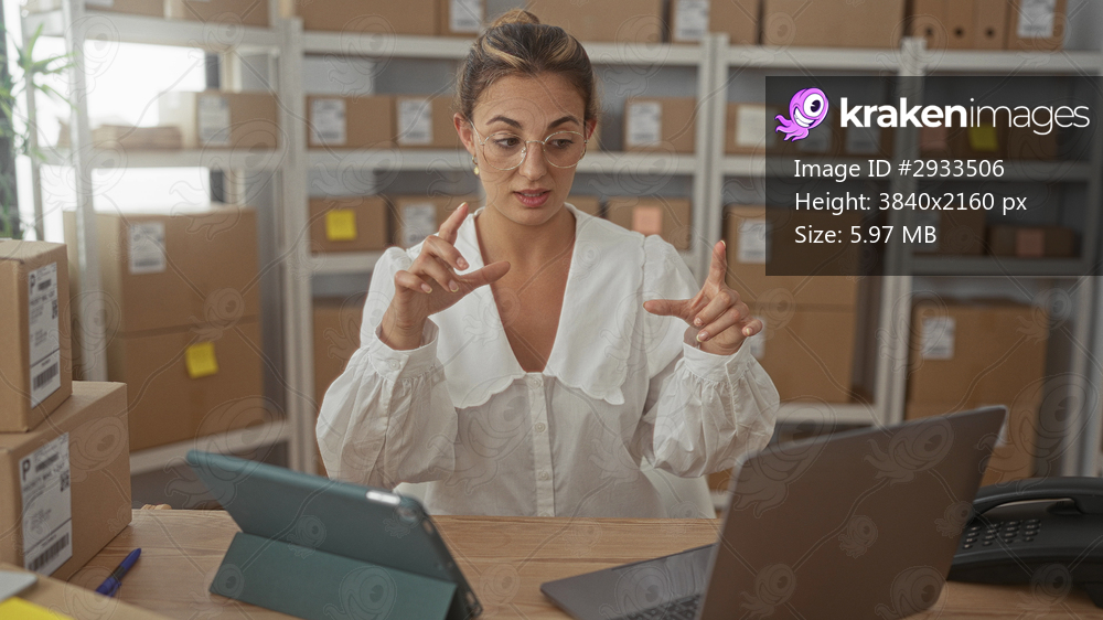 Woman wearing glasses and a white blouse gesturing while speaking over parcels, tablet and laptop at a packing desk in a building storage room; small business frustration. - Kraken Images